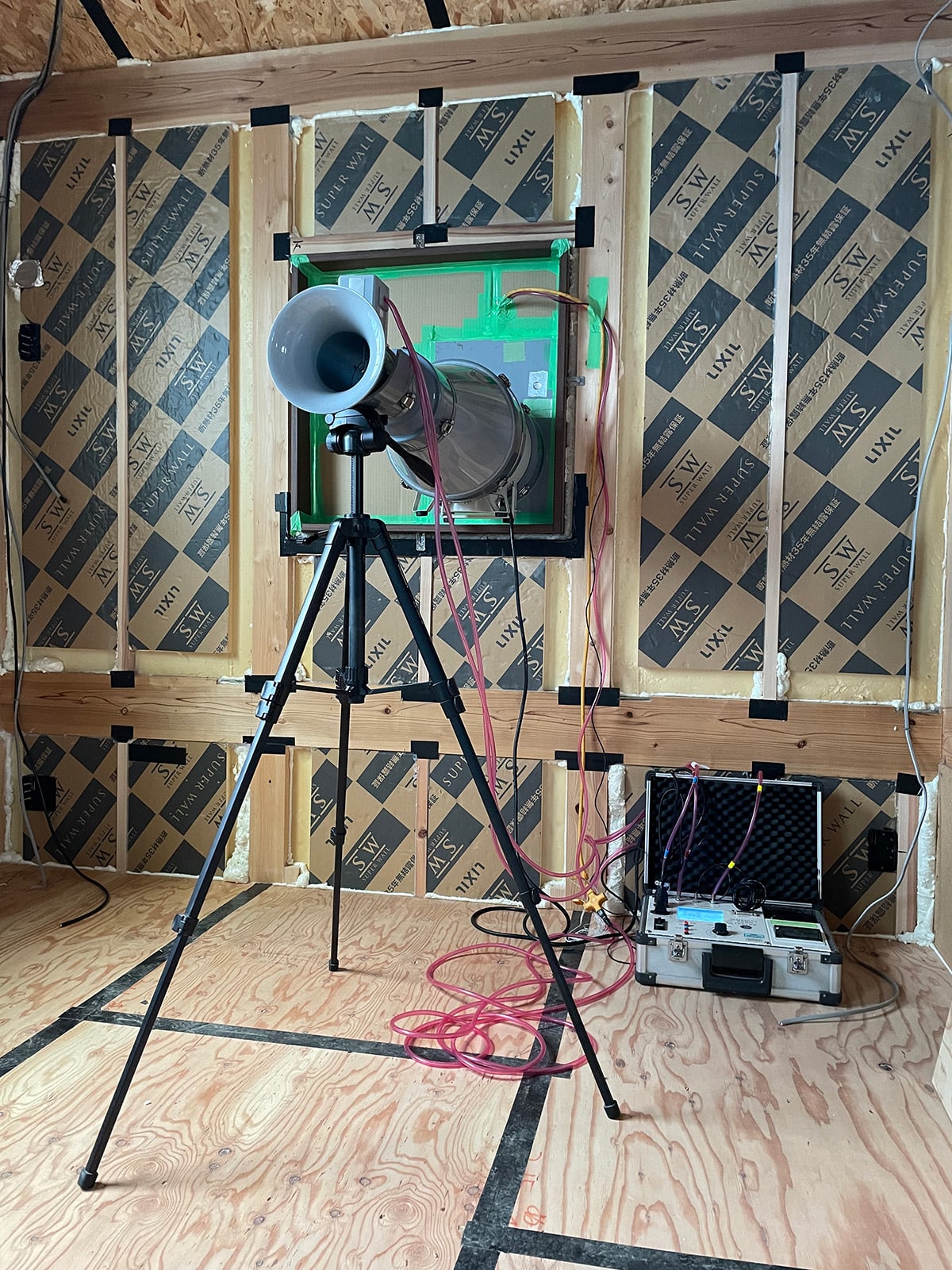 気密性能は、家の中にどれだけ隙間が少ないかを示す重要な数値です。当社では、気密測定を全棟で実施し、C値という指標でその性能を確認しています。一般的な住宅のC値は約5.0ですが、ブルームスタイルのC値は0.3と、非常に高い気密性を実現しています。この数値が小さいほど、隙間が少なく、冷暖房効率が向上し、室内の快適さを保ちます。