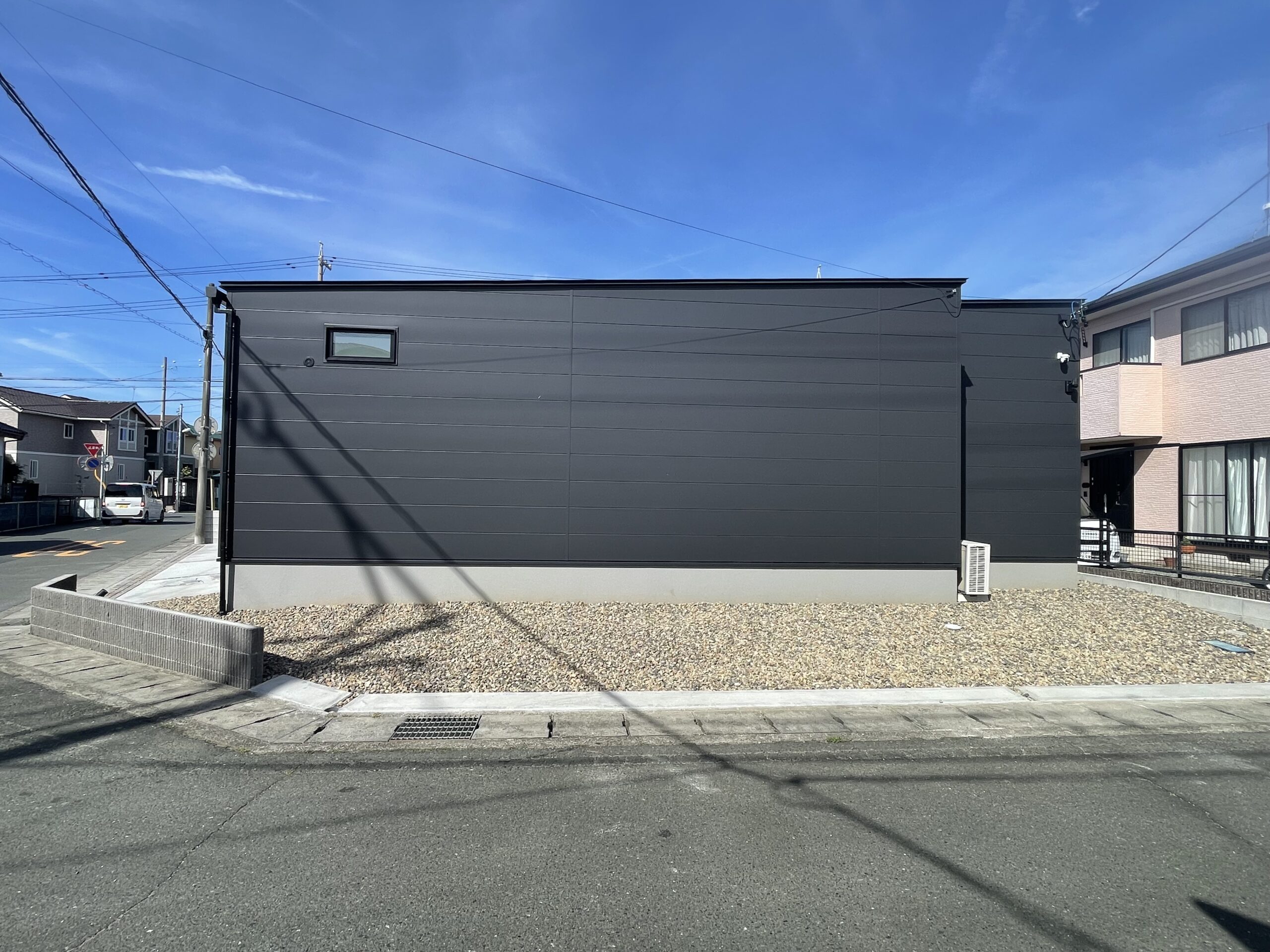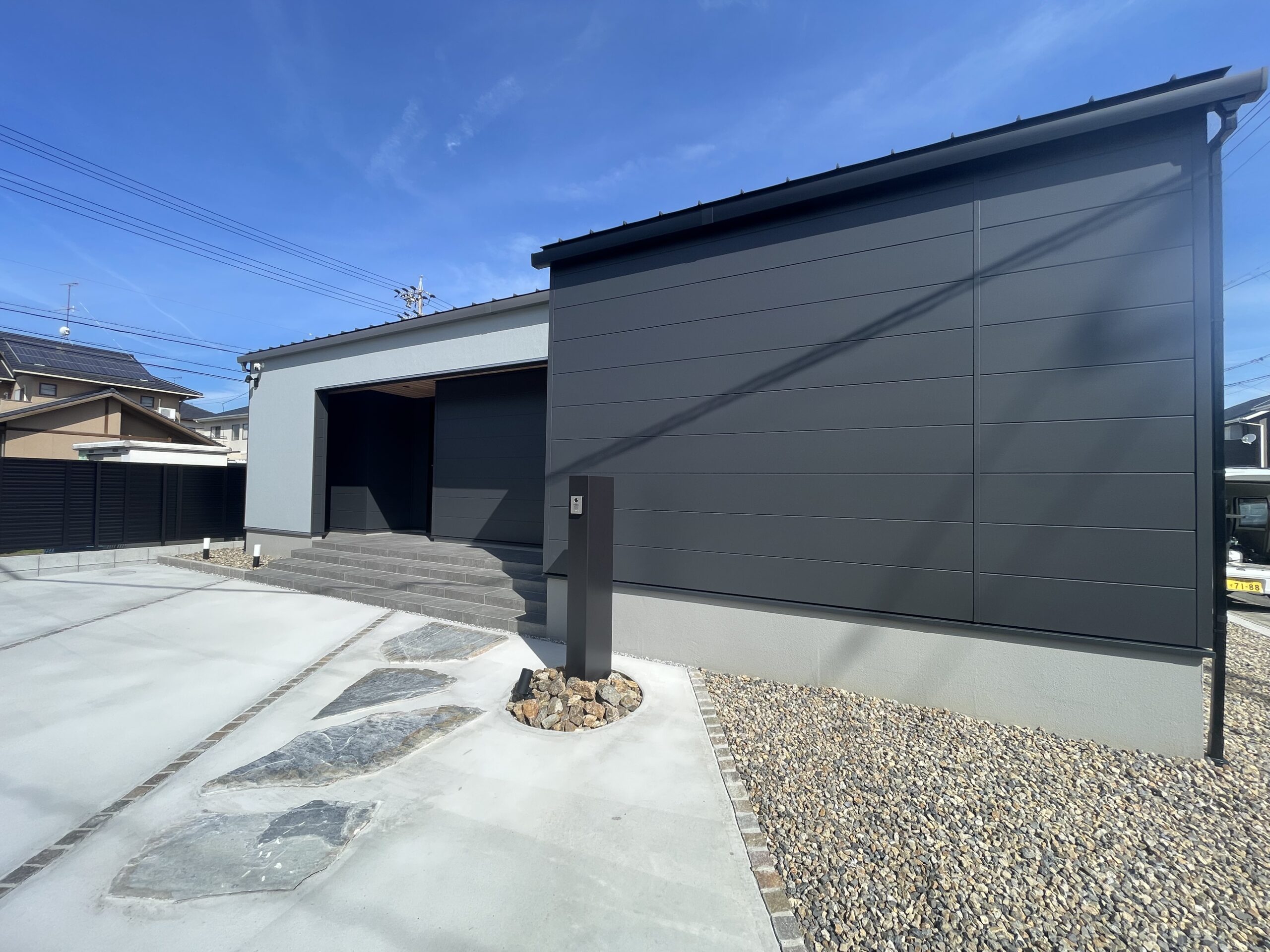 ダークグレーとライトグレーを組み合わせたモノトーンの外壁が、洗練された印象を与えます。