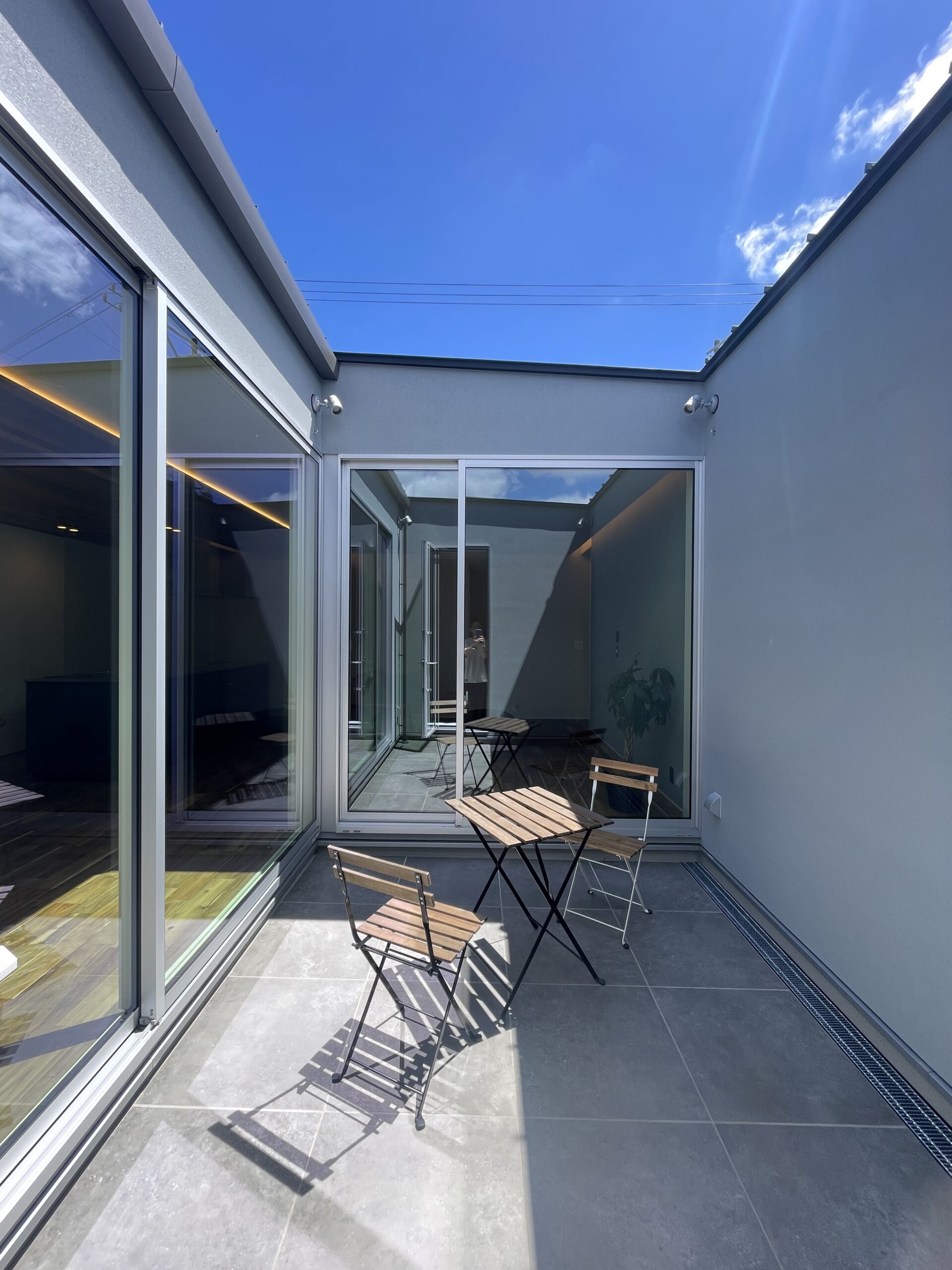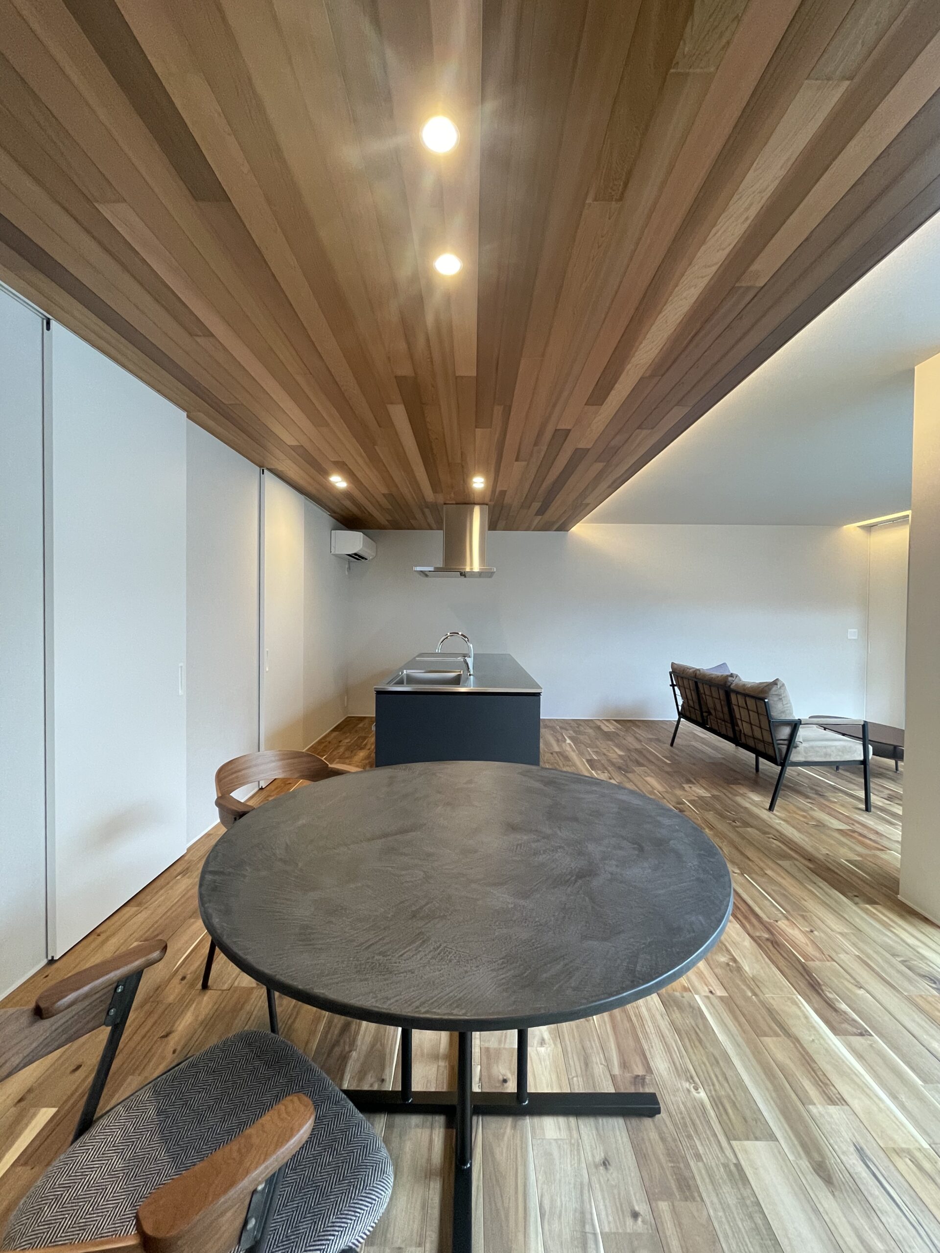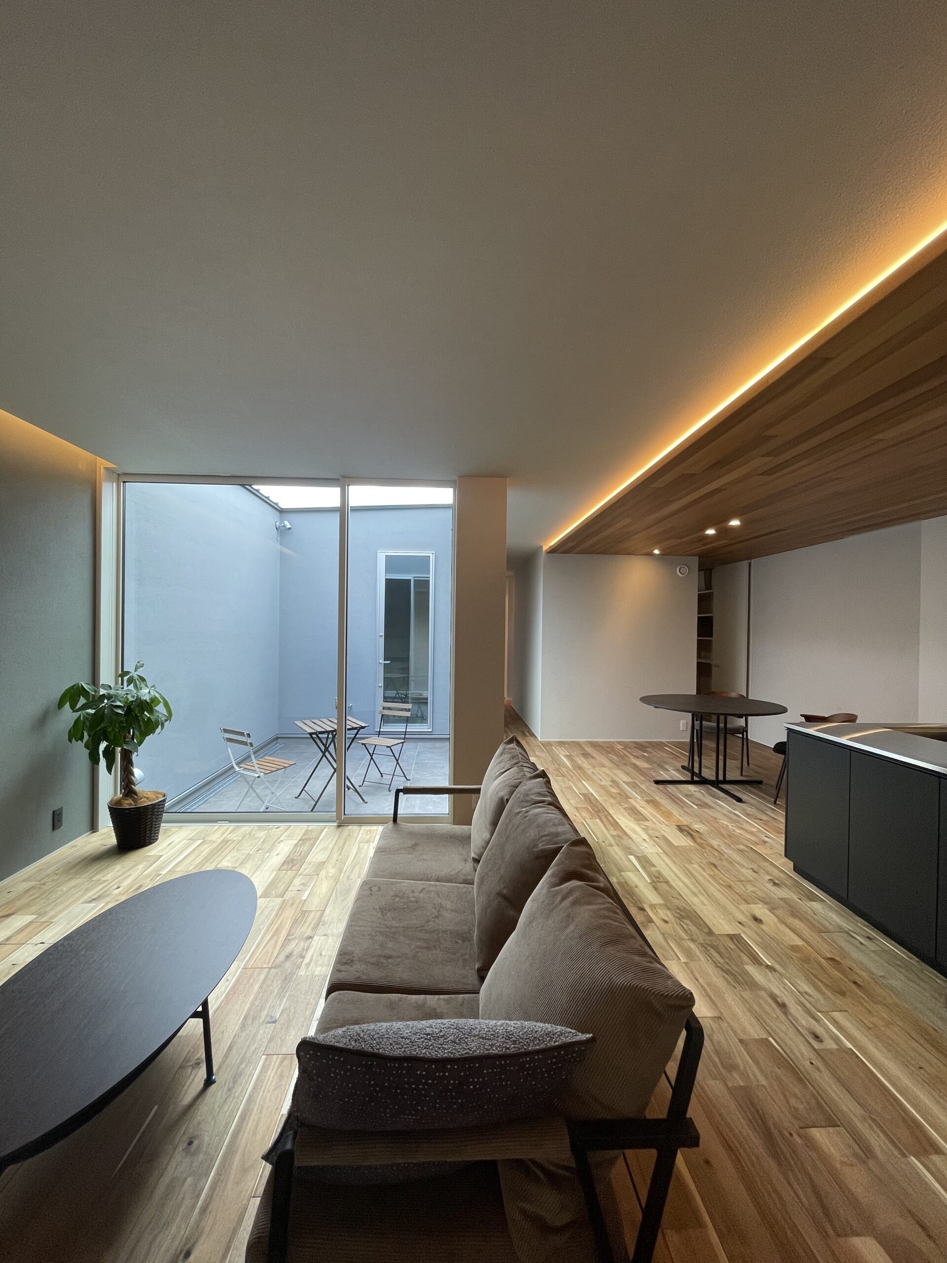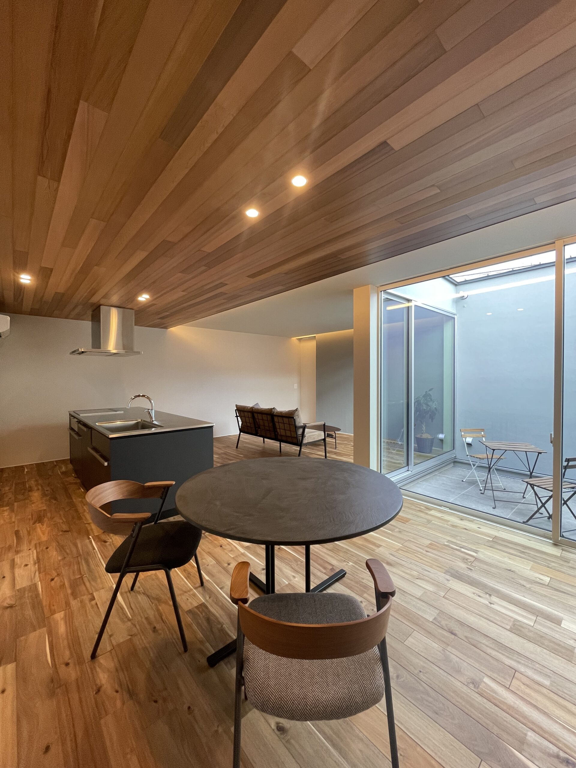 リビング・ダイニング・キッチンが中庭越しにつながり、広がりと開放感を演出。